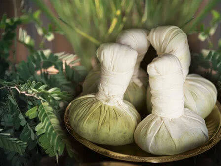 Elakizhi (Kräuterblattbündelmassage) ist eine traditionelle ayurvedische Therapie, bei der Heilblätter mit Kräutern geröstet, zu Bündeln gebunden und anschließend warm mit medizinischen Ölen auf den Körper aufgetragen werden. Sie lindert Gelenksteife und verbessert die Beweglichkeit.